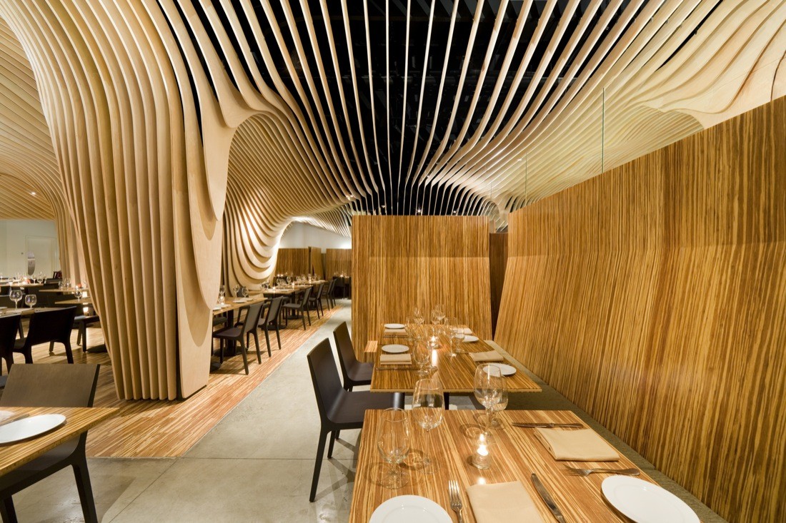BanQ餐厅位于老潘尼储蓄银行原来的银行大厅内。餐厅由两部分组成,靠近华盛顿大街的前半部分是个酒吧,而其后是较大的就餐区域。然而空间的设计却进行了另种竖向划分那就是天花和地面。如果要保证地面空间灵活多变的使用性以适应不同的活动需要,例如因聚会或其他活动带来的不同桌椅组合,二座、四座或六座,天花就好象建筑的基础设施样容纳那些固定的设备,结构、水管、电气设备、喷淋系统、照明以及声学系统。